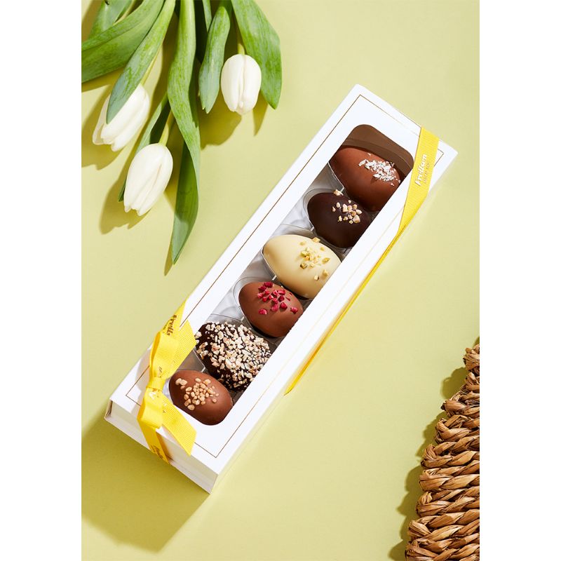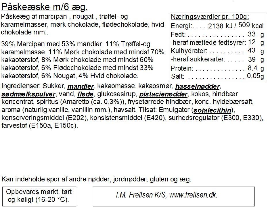 Hver æske indeholder 6 hjemmelavede chokoladeæg. Marcipan m/Kokos, Marcipanæg m/Pistacie, Marcipanæg m/Nødder, Karamelæg, Hindbæræg og Nougat/Krokantæg.