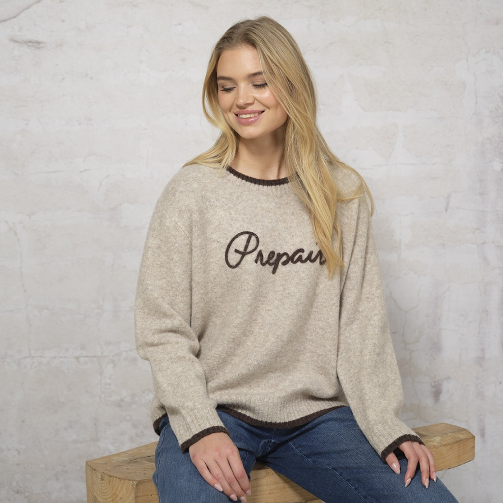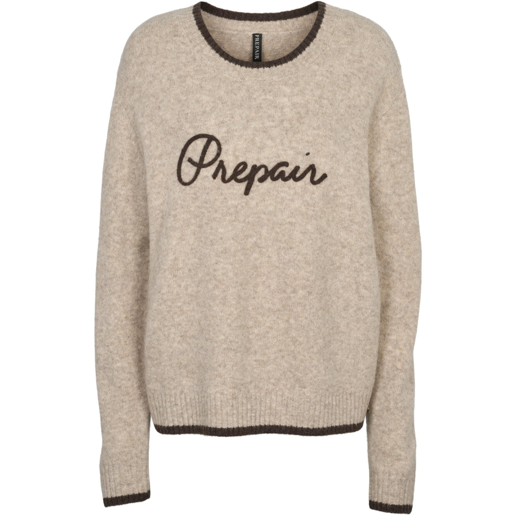 Gabrielle Knit er en blød og komfortabel strik med et afslappet og moderne udtryk, med rund hals og lange ærmer. Strikken har fine kontrastkanter samt rib ved halsudskæring, ærmer og bund. På fronten er et elegant “Prepair”-logo i kontrastfarve, som giver strikken et eksklusivt udtryk.
